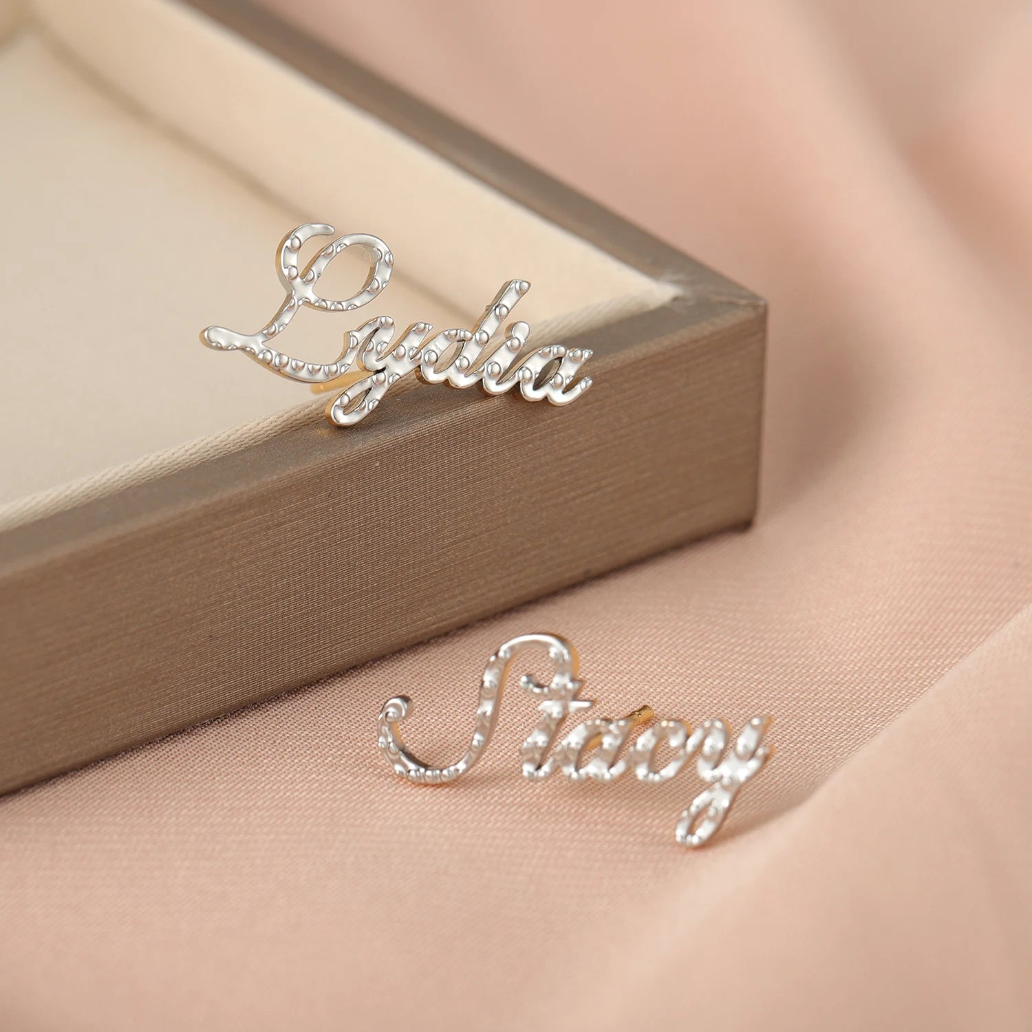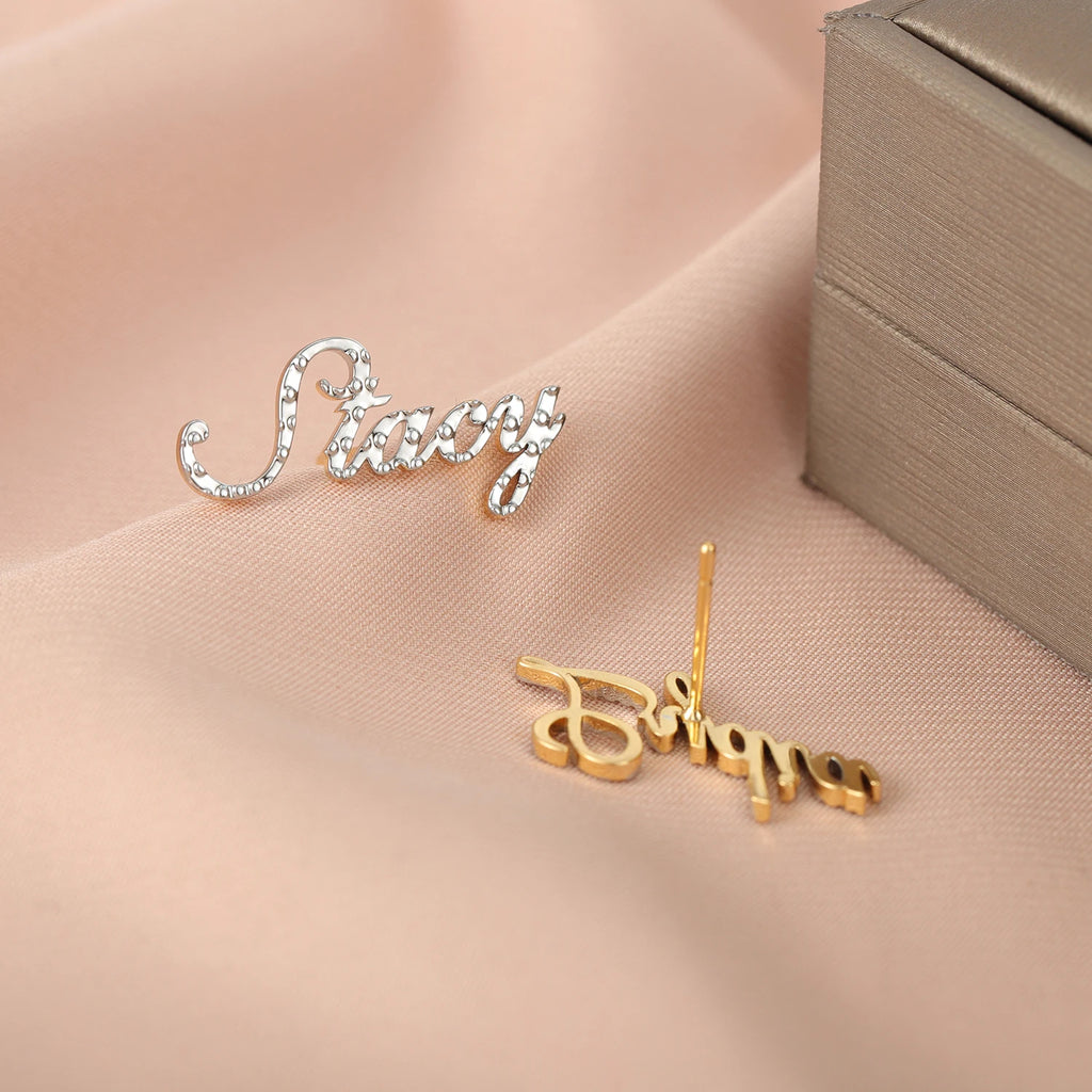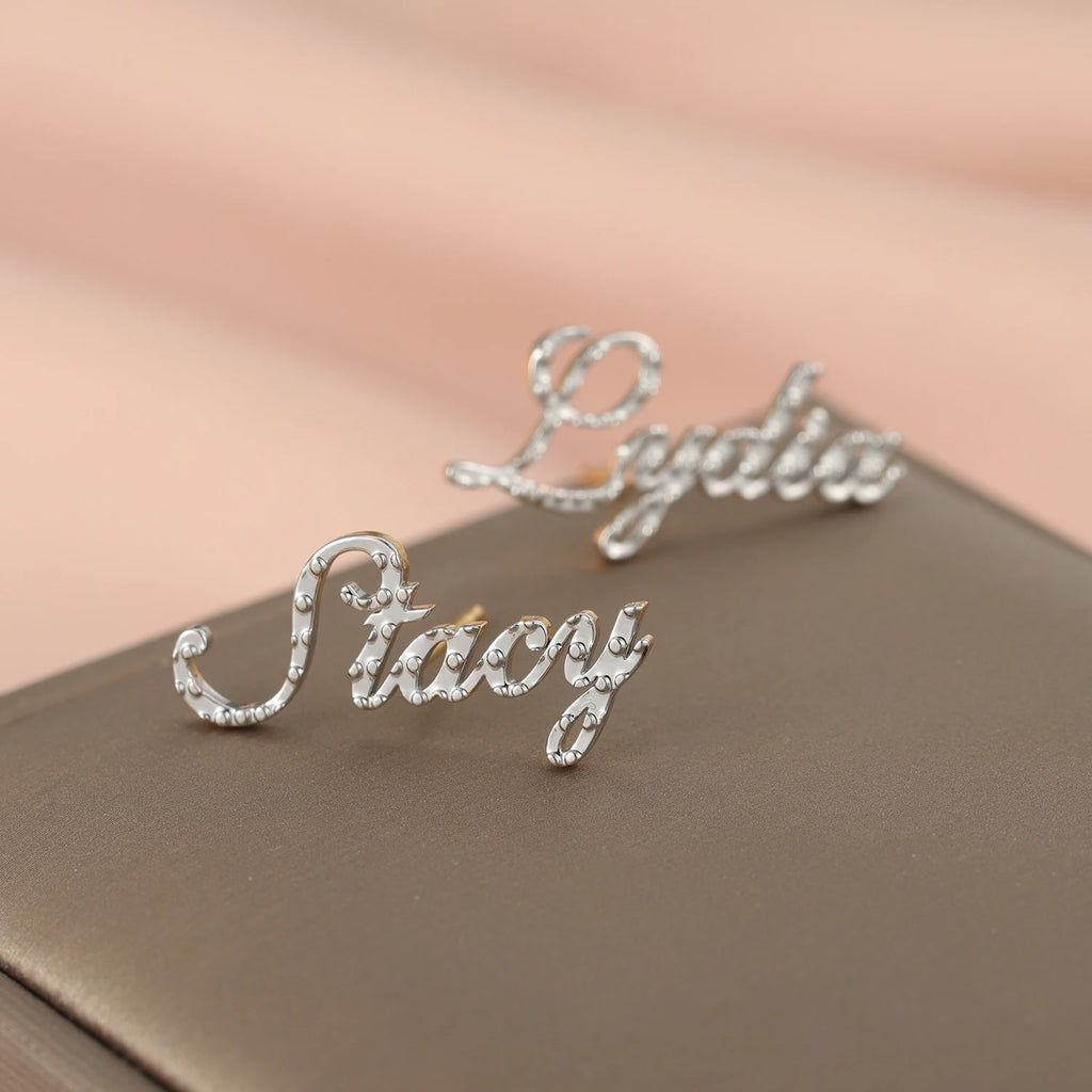 Turn heads and sparkle in style with our Glam Script Name Studs — the perfect mix of elegance and personal flair! These stunning earrings feature your name in a graceful cursive font, adding a touch of timeless glam to any outfit. Whether you’re dressing up for a special occasion or adding sparkle to your everyday look, these custom studs make a statement that’s uniquely you.